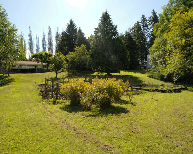 Yard has fruit trees, large dedicated area for a garden and flat grass area large enough for family baseball games.